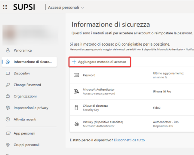 - Selezionare il tasto “+Aggiungere metodo di accesso”