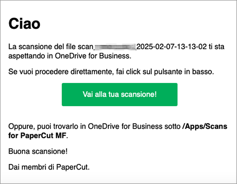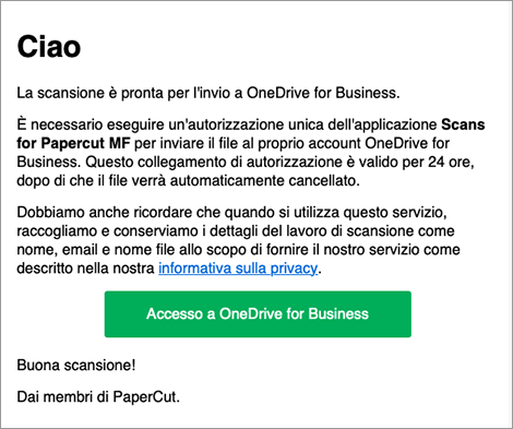 - Alla prima scansione, Papercut invierà una e-mail per la richiesta di autorizzazione ad accedere alla vostra cartella OneDrive. Accettare tramite il pulsante verde “Accesso a OneDrive for Business”.